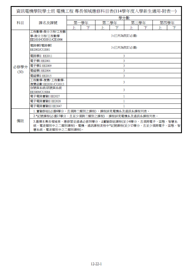 高年級課程延續必修理論課程,規劃「電子類別」、「固態類別」、「系統與生醫類別」、「電波類別」等四類別選修課程,提供學生依個人興趣,自由跨類別選修電機資訊各領域課程,持續培養學生基本專業與實務能力,及學習關心時事議題與對社會責任之認知。