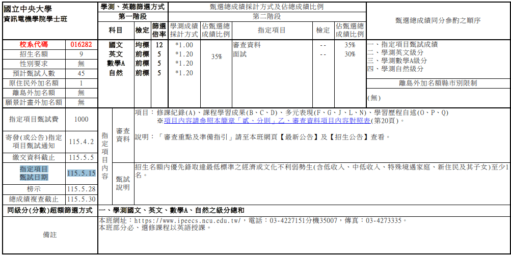 115申請入學 簡章、審查準備指引、二階甄試考生須知 已公告 於招生資訊網 https://admission.ncu.edu.tw/zh-TW/content/71/12 請在系網頁公告最新消息,連結至前述網址,謝謝。